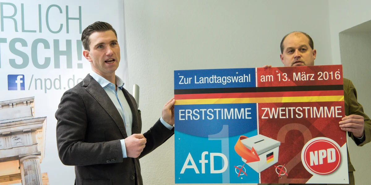 Die rechtsextreme, verbotsgefährdete NPD hatte eigens zu einer Pressekonferenz in ihre Bundeszentrale in Berlin geladen. Dort präsentierte ihr Vorsitzender Franz ein Plakatmotiv, das seine Partei in einer Zahl von etwa 1.000 Stück in der letzten Wahlkampfwoche noch aufhängen will. Geworben wird darauf für eine gemeinsame Stimmenabgabe bei den Landtagswahlen – mit der Zweitstimme für die NPD, mit der Erststimme für die AfD.