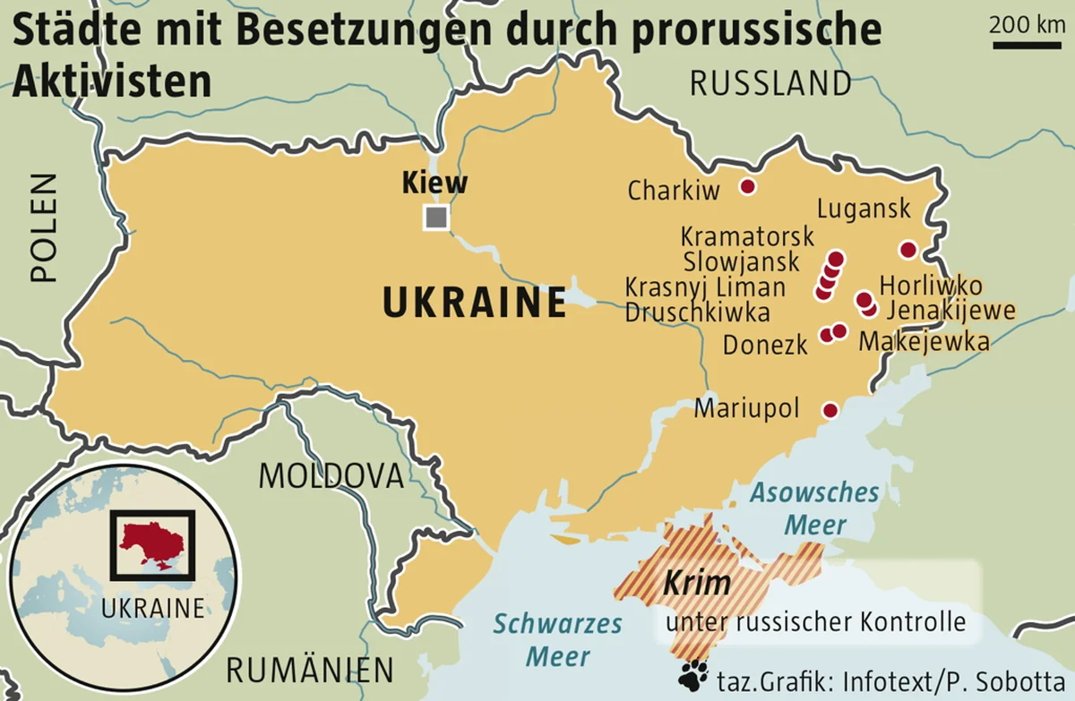 BERLIN/KIEW taz | Dem ukrainischen Militär gelingt es offenbar nicht, die Lage im Osten des Landes unter ihre Kontrolle zu bekommen. Auch am Mittwoch hielten prorussische Separatisten in zehn Städten Verwaltungsgebäude und Polizeistationen besetzt. In Slawiansk wechselten Berichten örtlicher Medien zufolge Regierungseinheiten die Seiten. Durch die Stadt fuhren mindestens sechs Schützenpanzer mit der russischen Flagge.