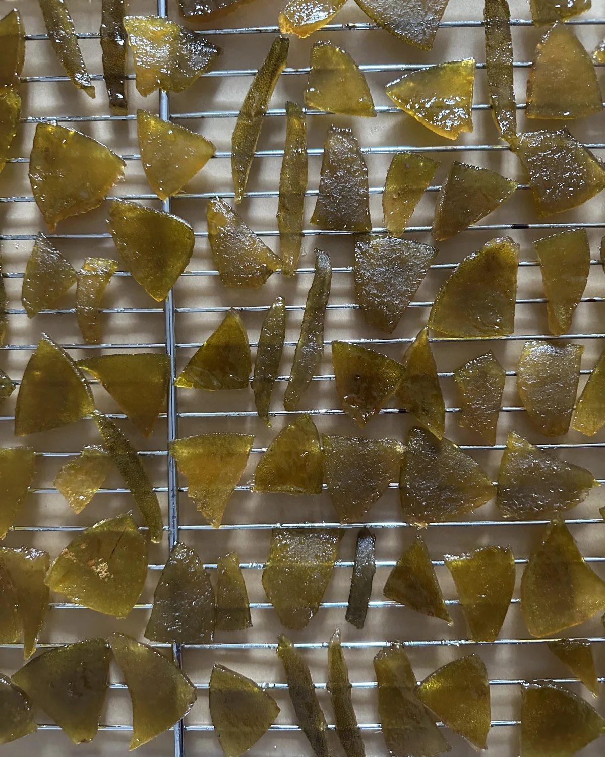 Als die Bergamottenstreifen gegen Mitternacht zum Trocknen auf einem Abtropfgitter lagen, war mir dann auch recht triumphal zumute. Die hatte ich erschaffen! Und sie leuchteten wie sonnenbeschienene Kirchenfenster.