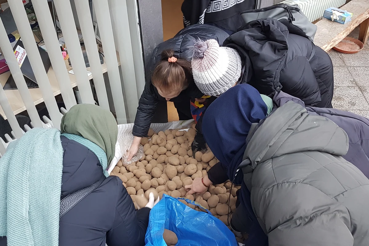Eine Tonne Kartoffeln passt in den Big Pack, der in der Pallasstraße vor dem Laden der Stadtteilkoordination Schöneberg Nord steht. Frauen jeden Alters umringen den weißen Plastiksack, viele tragen Kopftücher und lange Mäntel. Mit beiden Händen wühlen sie in den sandigen braunen Erdäpfeln, stopfen sie in mitgebrachte Einkaufstaschen und Beutel. Kleine und mittlere Kartoffeln sind besonders begehrt. „Drei, vier Kilo pro Person“, mahnt eine Stadtteilmutter vom Stadtteilbüro, die die Verteilaktion begleitet. Bei Müttern, wo sie weiß, dass große Familien zu ernähren sind, lässt sie größere Mengen durchgehen.