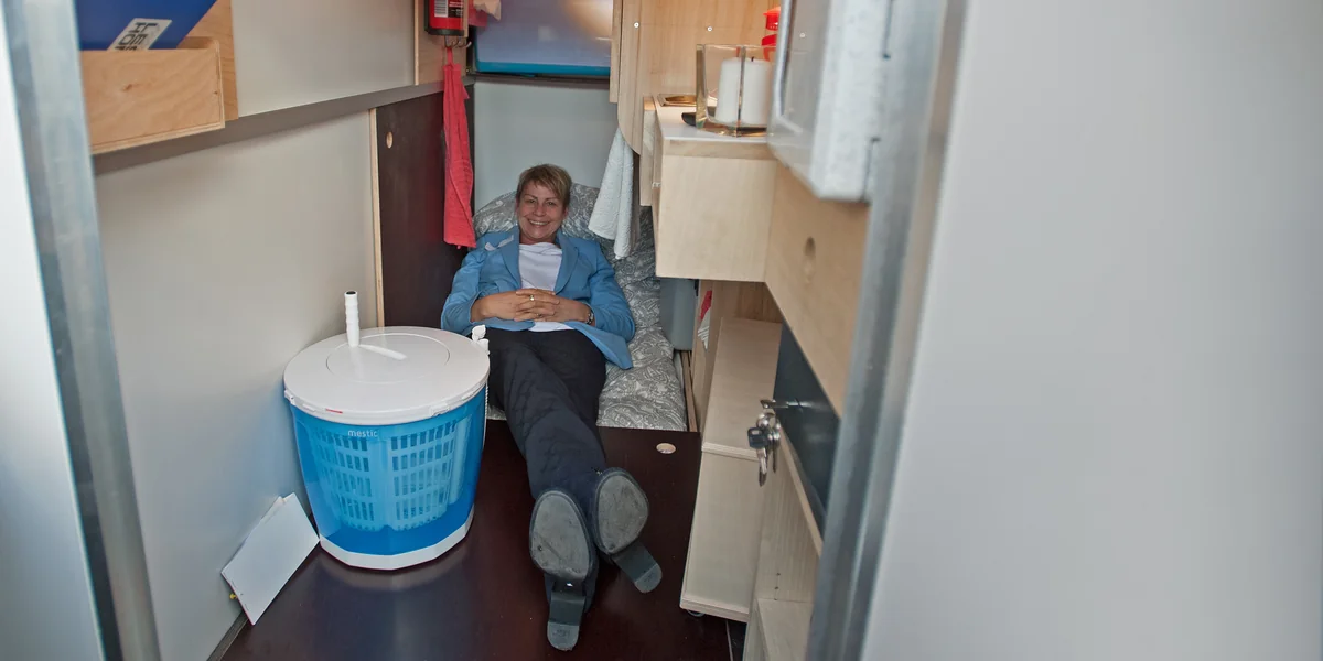 Zum anderen ist es nicht nur mit einem Bett ausgestattet, sondern „mit allem, was die normale Infrastruktur eines Lebens ausmacht“, sagt Goergens. Konkret heißt das: Gaskartuschenkocher, Kühlschrank mit Langzeitakkus, kleiner Fernseher, Kaffeekocher, Handwaschmaschine, Sitzdusche, Trockentoilette, Schränke. Sogar ein Briefkasten und ein Fach für Spenden aus der Nachbarschaft sind an der Außenwand angebracht. Jeder Winkel des Handwagens wird ausgenutzt, ein doppelter Boden kann über das Bett geklappt werden. Und weil sie kurz vor Weihnachten aufgestellt werden sollen, sollen sie auch mit einem kleinen beleuchtbaren Tannenbaum ausgestattet werden.