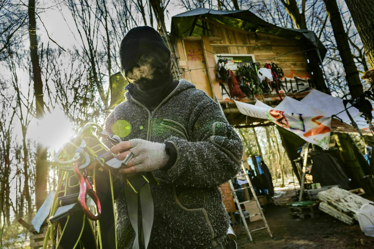 Eine kleine Fläche Bäume ist geblieben. Darin hängt ein Dutzend Baumhäuser, nach wie vor bewohnt von rund zwei Dutzend Leuten, die den Wald schützen wollen.