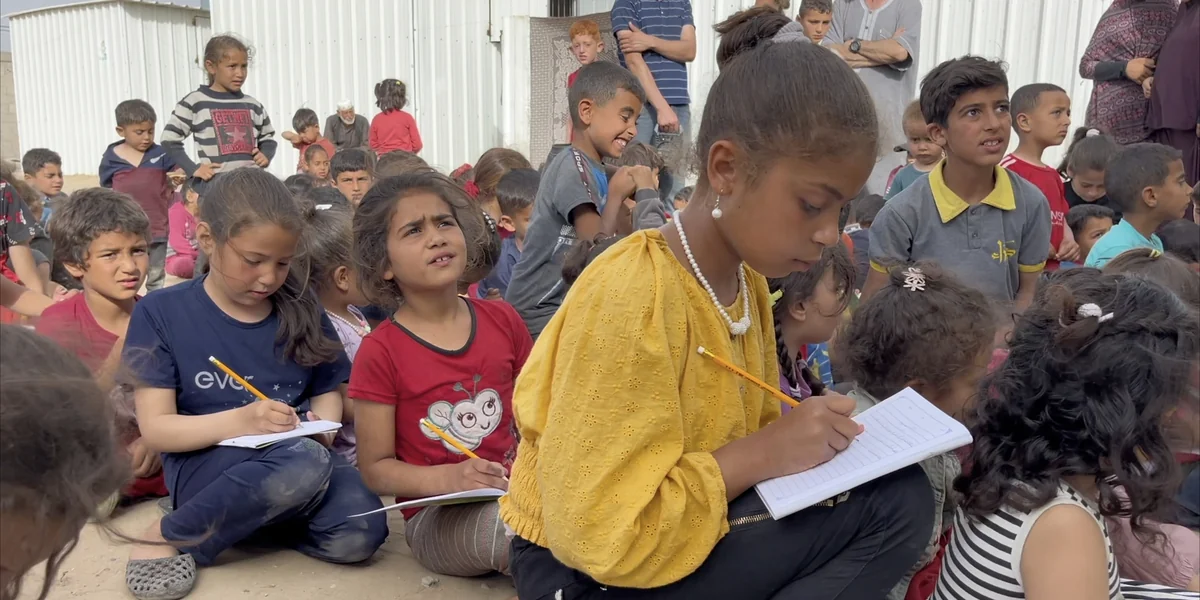 Die Drittklässlerin Iman Ahmad hat Glück gehabt und geht mit einem Heft nach Hause, beziehungsweise zu dem Container, in der ihre Familie lebt, seit sie aus Gaza-Stadt vor den israelischen Angriffen geflohen ist. Dort verbringt sie den Tag mit ihren Geschwistern. Aber auch hier ist es nicht sicher. „Vor dem Krieg bin ich jeden Morgen aufgewacht, habe gefrühstückt und meine Schuluniform angezogen. Jetzt wache ich auf, wenn ich die Explosionen höre. Aber ich habe mich inzwischen daran gewöhnt“, erzählt sie.