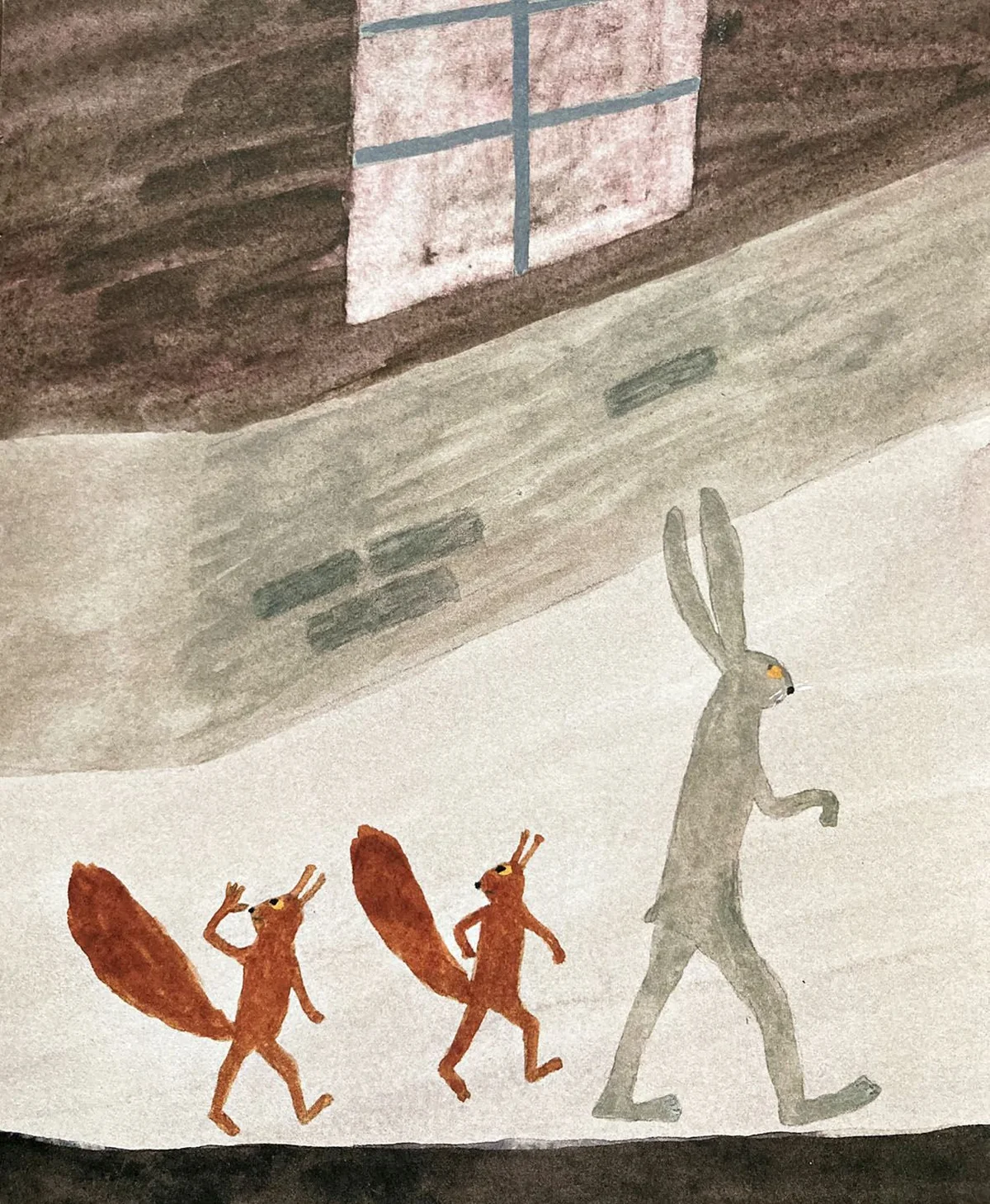 Mit transparent überlagernden Aquarellfarben lässig skizziert, erzählt Eva Lindström in „Wir sind die Könige des Waldes, sozusagen“ von einer doch ernsten Situation. Denn auf der Versammlung im Gemeindehaus wurden die beiden Eichhörnchen und ihre Freundin, die Häsin, überstimmt. Die Befürworter der Jagd haben sich durchgesetzt. Mit der Ruhe im Wald wird es also bald vorbei sein.