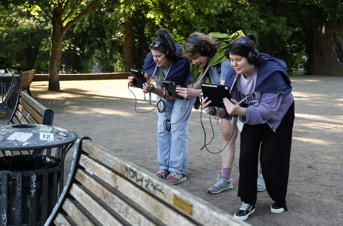 Für die „Fundstadt“-Premiere in Bremen haute das hin, nicht nur der Part fürs Publikum, sondern auch für ganz normale Spaziergänger:innen, die sich urplötzlich zwischen Menschen mit bunten Capes, Kopfhörern und umgehängten Tablets wiederfanden, die auf der Suche nach aufgeklebten QR-Codes um Parkbänke schlichen, Laternenpfähle und Mülleimer inspizierten.