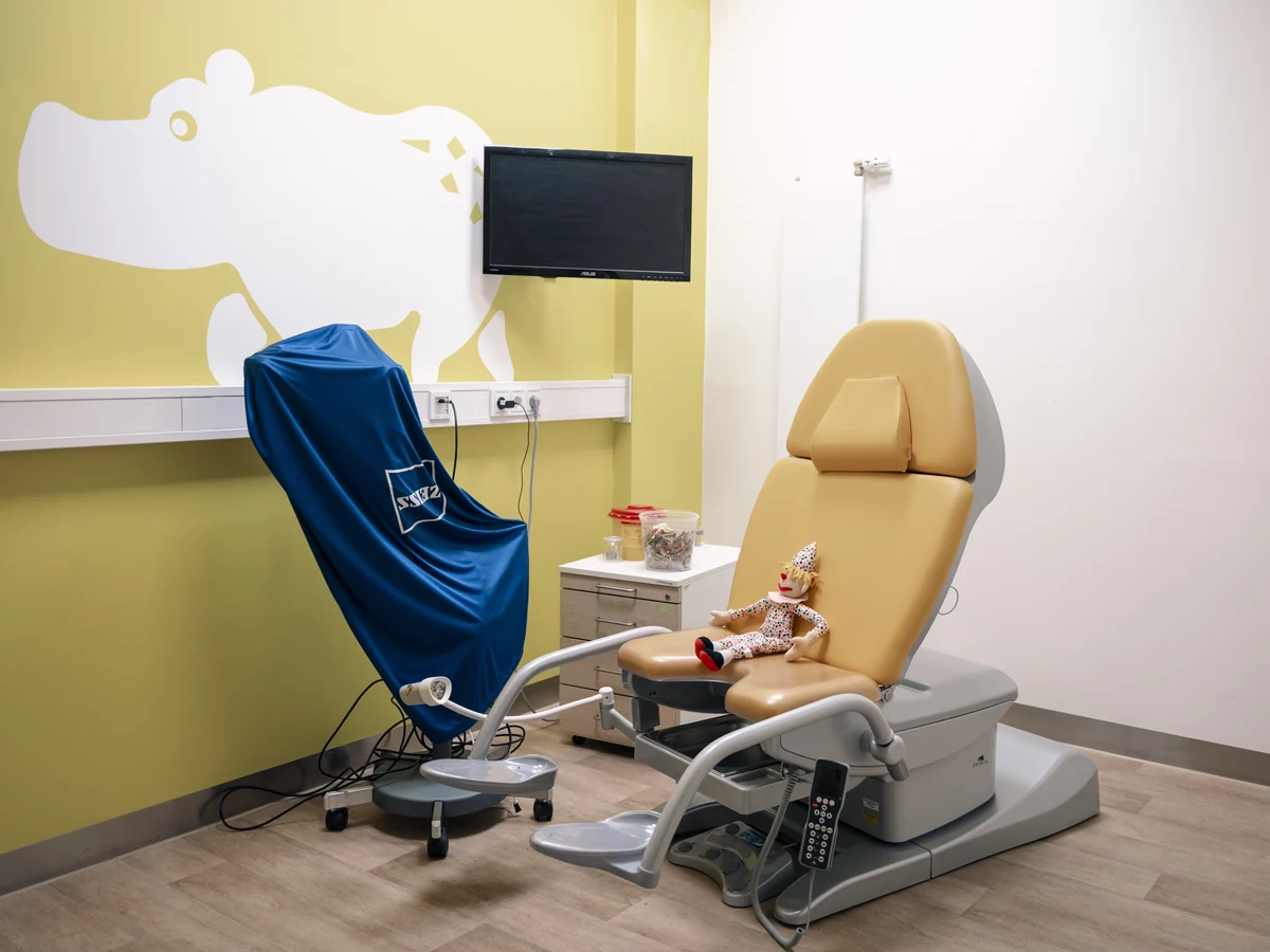 Zwar ist im Untersuchungszimmer mit Liege und gynäkologischem Stuhl medizinische Ausrüstung vorhanden, auf der Liege aber sitzt eine Puppe mit dickem roten Haarschopf und auf dem Computer ein kleiner Clown. Steriles Weiß oder Grün, wie in Krankenhäusern oft üblich, wurde durch freundliches Gelb und Tierzeichnungen an den Wänden ersetzt. Zum Teil gehe es hier um medizinische Untersuchungen, zum Beispiel auf Schwangerschaft, oder auch um Spurensicherung, sagt Anna Sterling, die als Psychologin im Haus arbeitet. Es gehe aber auch darum, mit den Kindern und Jugendlichen zu sprechen, zum Beispiel über ihre Ängste und darüber, wie das Erlebte verarbeitet werden kann. „Sprechen bedeutet Entlastung.“