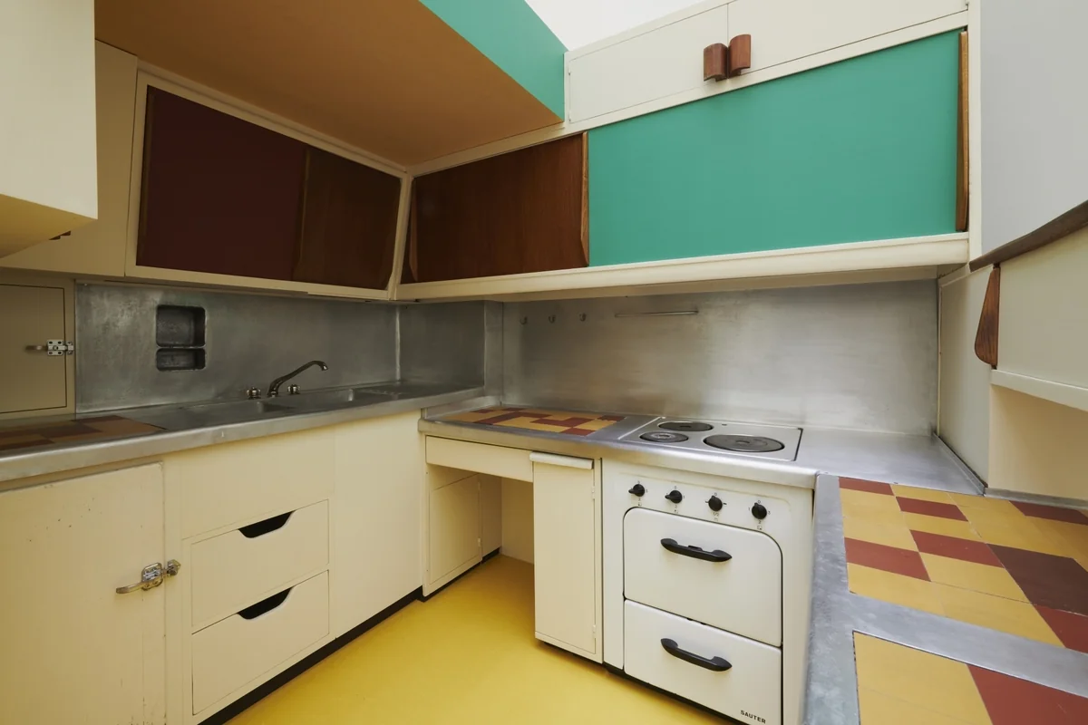 Ähnlich funktional und sogar noch etwas kleiner als die Frankfurter zeigt sich die Küche des Architekten Le Corbusier, des Meisters des Bauhauses, aus den späten 1940er Jahren. Sie ist deutlich farbenfroher: Manche Küchenfächer haben eine Schiebetür, andere sind braun. Die Arbeitsflächen bestehen aus ocker-dunkelroten Steinkacheln. Ein sehr kleiner Kühlschrank mit einem altertümlichen Verschlussgriff sticht hervor.