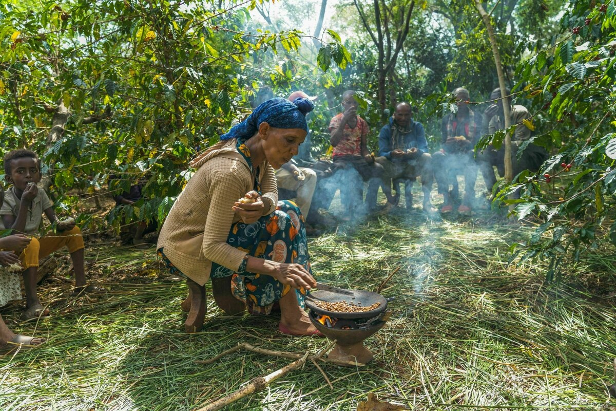 Mulu Tashome sitzt auf einer kleinen Lichtung auf einem Holzschemel. Vor der 35-jährigen Äthiopierin liegt eine Pfanne über den glühenden Kohlen einer Feuerschale. Vorsichtig bewegt Tashome milchig-grüne Kaffeebohnen hin und her, bis sie dunkelbraun glänzen. Anschließend stößt sie mit rhythmischen Schlägen einen etwa einen Meter langen Stößel in die Bohnen, die in einem hölzernen Mörser liegen. Das feingemahlene Kaffeepulver gibt sie direkt in das kochende Wasser einer metallenen Kaffeekanne.