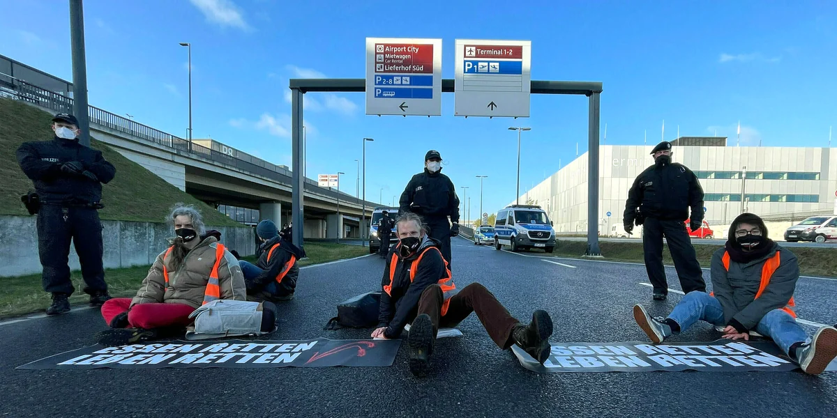 Aktivist*innen vom „Aufstand der letzten Generation“ blockieren eine Flughafenzufahrt Foto: Paul Zinken/dpa