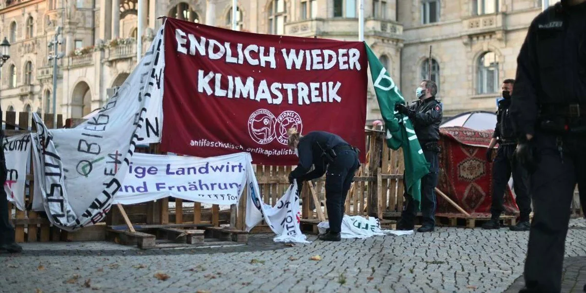 Seit einer Woche campen Klimaaktivist*innen direkt vor dem Rathaus in Hannover. Am Sonntag rückte die Polizei an und entfernte Plakate.