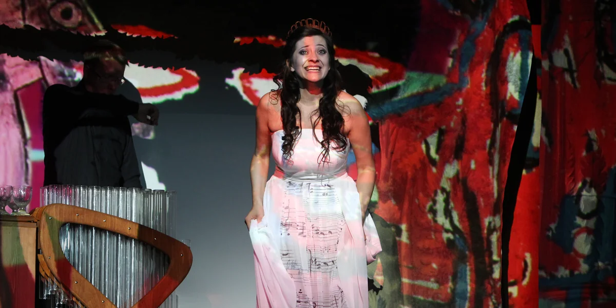 Und „Eccolà“ ruft, mit schön eklig-selbstgefälligem Bass Christoph Heinrich als Pfaffe Raimondo Bidebent – mit Bi am Anfang wie bigott – und lenkt noch einmal mit theatraler Geste die Blicke aufs Beweisstück. Und dann singt, neben der Bühne-auf-der-Bühne, Lucia di Lammermoor ihre berühmteste Arie. In deren Walzertraum sieht sie wach ihr unmögliches Liebesglück, Rosen, hört „un’armonia celeste“, und makellos klar ist der Sopran Nerita Pokvytytes, straight und rein, alles in Dur. Wunderschön singt diese Lucia. Und fast ebenso schön klingt und tönt die Glasharmonika unablässig, und begleitet sie. Also muss ihr Singen Wahnsinn sein.
