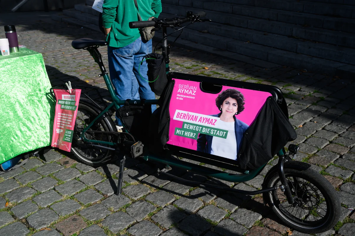 Die Bitte hat für Aymaz eine gewisse Dringlichkeit: Die letzten Umfragen sagen ein Kopf-an-Kopf-Rennen voraus: Bei der Direktwahl des Stadtoberhaupts würden sich gerade einmal 13 Prozent für Aymaz entscheiden. Doch auch der Erstplatzierte, der Sozialdemokrat Torsten Burmester, bis Ende 2024 Vorstandsvorsitzender des Deutschen Olympischen Sportbunds, kommt gerade einmal auf 15 Prozent Unterstützung, ermittelte Forsa Ende August. Und auch für den CDU-Kandidaten Markus Greitemann, bisher Baudezernent in Köln, ist die Stichwahl, also das unvermeidbar scheinende Rennen zwischen den beiden Bestplatzierten, mit 11 Prozent noch in Reichweite.