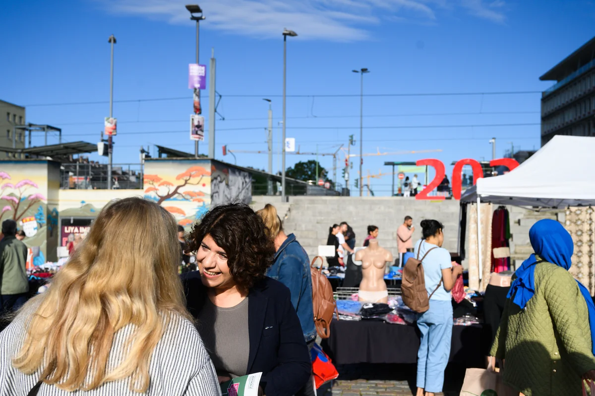 Die Landtagsabgeordnete, die bei den am Sonntag anstehenden Kommunalwahlen Oberbürgermeisterin von Deutschlands viertgrößter Stadt werden will, setzt hier auf den Direktkontakt zu den Bürger:innen. „Am 14. September ist Kommunalwahl“, spricht Aymaz potenzielle Wähler:innen an – und drückt ihnen Flyer mit ihrem Konterfei in die Hand, auf denen sie bezahlbare Wohnungen, besseren Nahverkehr, mehr Klimaschutz, aber auch mehr Sicherheit im öffentlichen Raum verspricht. „Gehen Sie wählen, unterstützen Sie mich“, bittet die Kandidatin.