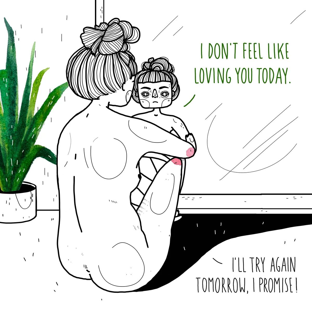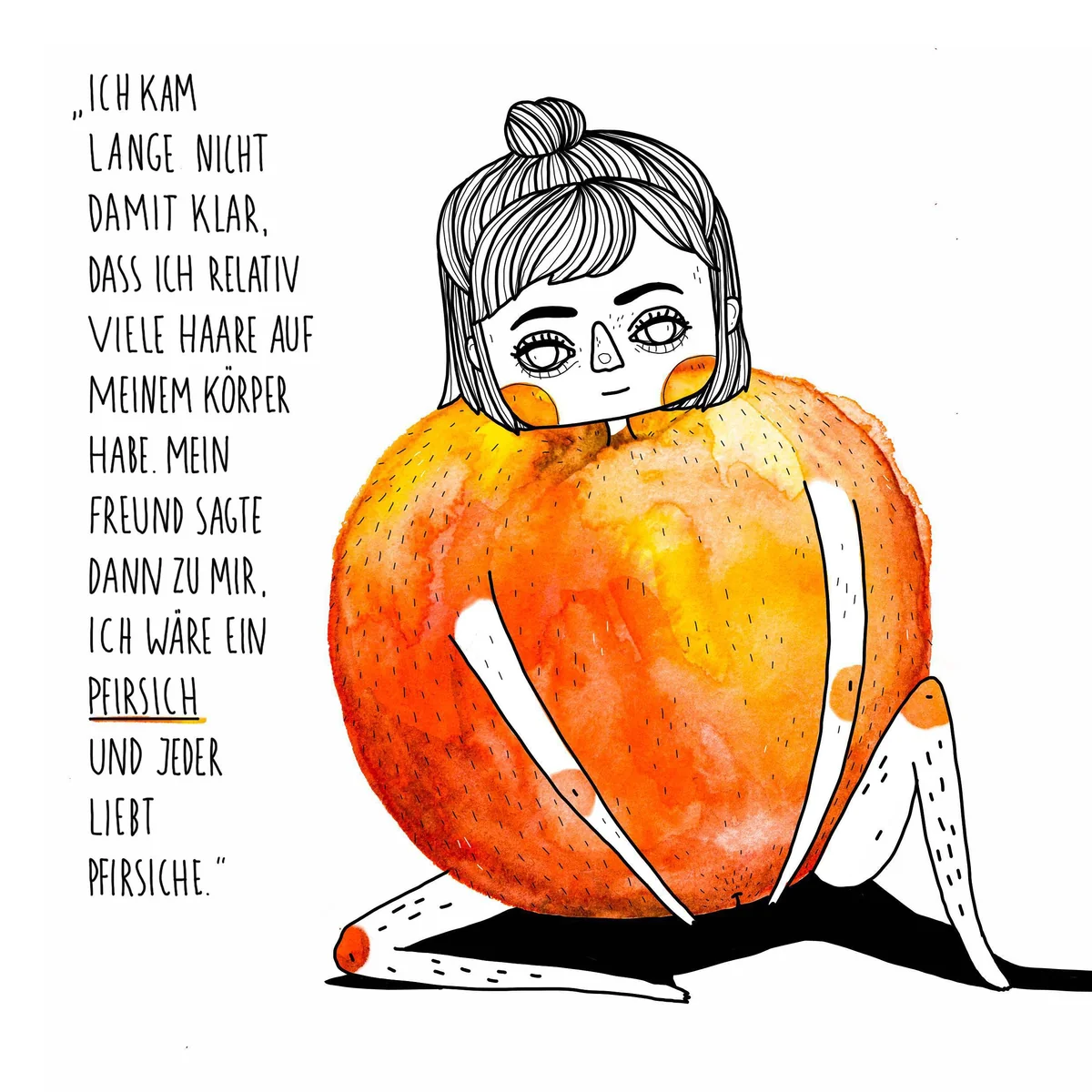 Die Instagramerin Laura Klinke aus Leipzig geht einen anderen Weg. Ihre motivierenden Botschaften für ein positives Körpergefühl verbreitet sie nicht mit ihrem eigenen Körper, sondern mit Zeichnungen. 24.000 Menschen folgen ihrem Instagramprofil mit dem Namen „loveyourselffirst.project“. Die Botschaft trägt Klinke zur täglichen Erinnerung sogar als Tattoo. Ihre Bilder befassen sich mit Tabuthemen, meistens in Bezug auf Frauenkörper: Körperbehaarung, Regelblutung, Leberflecke – Klinke zeichnet persönliche Geschichten, die ihr „fast täglich“ zugeschickt werden. „Es gibt Frauen, die denken, dass sie zum Beispiel mit Pickeln am Po völlig allein sind und dass das niemand anderes hat.“ Ihre Zeichnung dazu zeigt einen Po mit kleinen roten Sprenkeln. Dazu schreibt Klinke, dass Hautunreinheiten an dieser Stelle nichts zum Schämen sind: „Der Pickel vergeht, aber das, was ihr deswegen verpasst, das kommt nicht noch mal wieder.“
