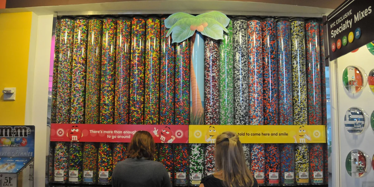 Ich bin nur ein dummes Schaf – und trottete hinterher. Auf vier Etagen werden dort Produkte von „M&M“ angeboten, vom Knabberzeug in allen Varianten, Farben und Formen bis hin zu Merchandise-Unterhosen, -Schlafanzügen, -Stofftieren und allem, was groß genug ist, um ein „M&M“-Logo draufzudrucken.