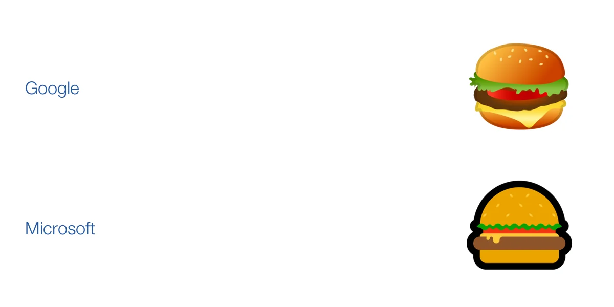 Nun ist ein Unicode-Zeichen nicht mehr als eine abstrakte Idee. Die grafische Ausführung ist nicht vorgegeben. Und so wie es Zigtausende von Schriftarten gibt, gibt es eben auch mehrere Emoji-Alphabete. Zum Teil von Telefonanbietern wie Samsung, Apple, HTC, zum Teil von Diensten wie Facebook, WhatsApp, Twitter. Weil alle auch noch regelmäßig re-designt werden, gibt es von einigen Emojis inzwischen zig Varianten. Und welchen Cheeseburger Sie jetzt in der Überschrift sehen, hängt genau davon ab, auf welchem Gerät Sie diesen Text lesen.