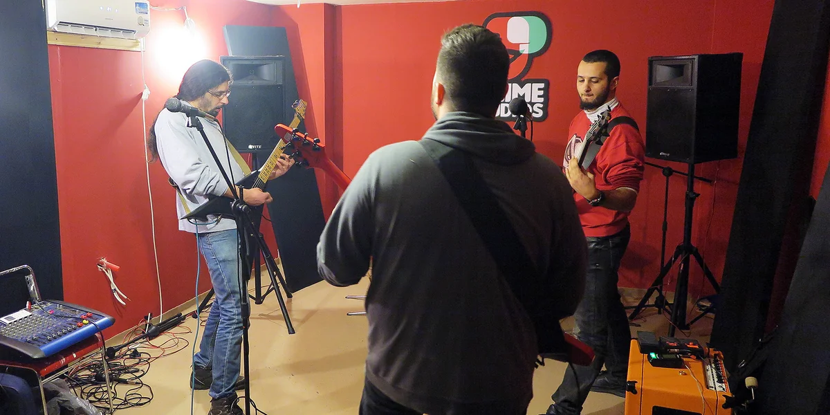 „Metal drückt unsere Emotionen aus, unsere Wut“, sagt Gitarrist und Sänger Nader in der Pause. Er hat die Haare zum Zopf gebunden und trägt einen spitzen Kinnbart. In der Hand hält er seine gezackte E-Gitarre. Die anderen Musiker, Mahmoud, Ibrahim und Sultan, stehen um ihn herum.