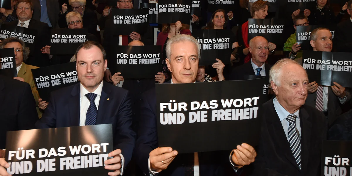 D er Eröffnungsabend der Buchmesse im Leipziger Gewandhaus steht traditionell im Zeichen einer Selbstvergewisserung der Werte. Der Vorsteher des Börsenvereins des deutschen Buchhandels Heinrich Riethmüller klang dabei für seine Verhältnisse dieses Jahr fast schon aktionistisch. Er rief die Versammelten aus Buchbranche und Politik dazu auf, deutlich Flagge für die Demokratie zu zeigen. Auf sein Zeichen erhob sich das Publikum zum Fotoshooting. Hunderte streckten vorgefertigte Pappschilder in die Höhe. Auf denen stand: „Für das Wort und die Freiheit“.