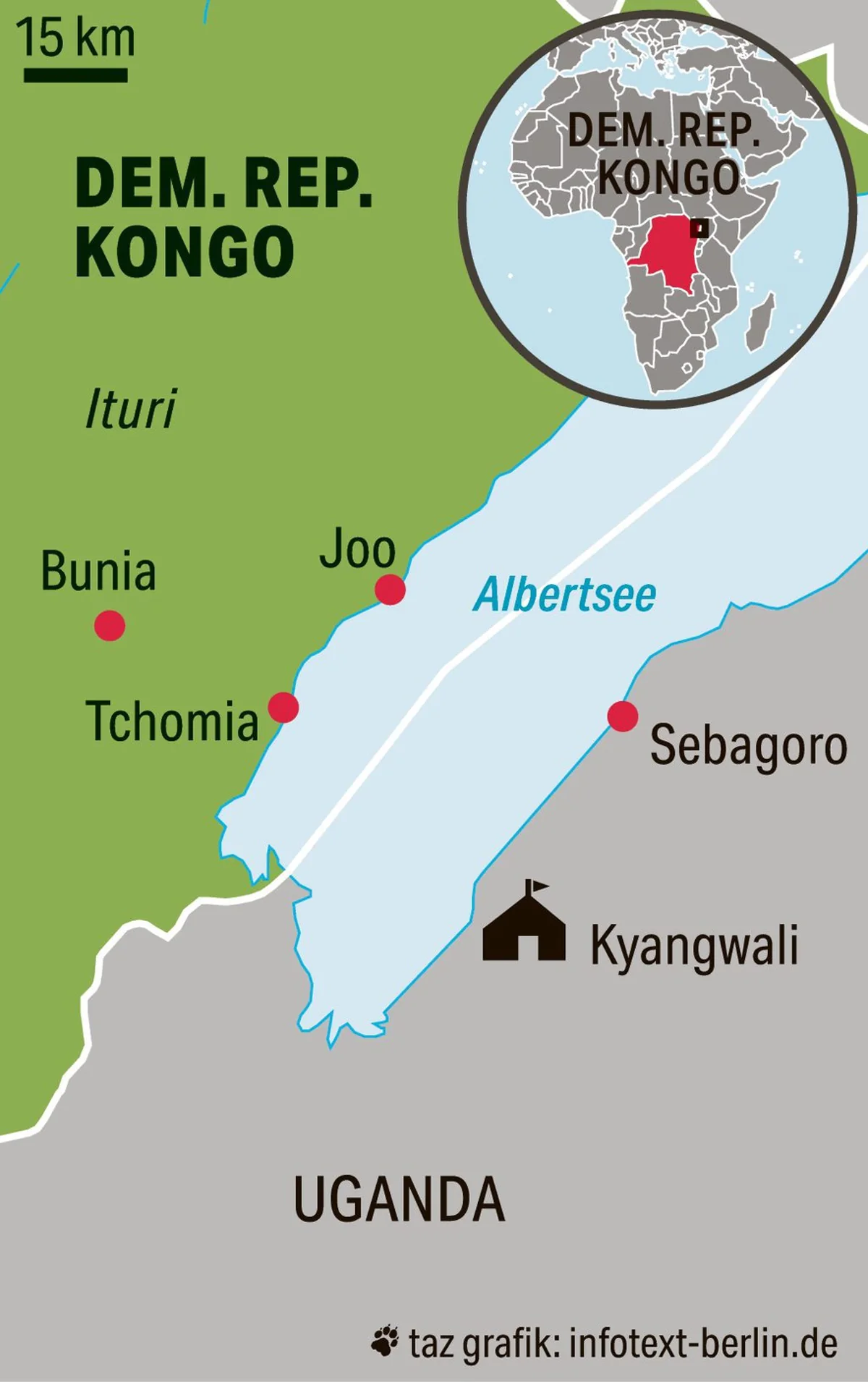 Die Oberfläche des Albertsees ist spiegelglatt. Sanft plätschern ein paar Wellen an den Strand. Am Horizont lassen sich die Berge am kongolesischen Ufer erahnen. „Manchmal sehen wir Rauchsäulen aufsteigen, wenn die Dörfer brennen“, sagt der Kommandant der ugandischen Marine, der mit seinem Funkgerät an der Anlegestelle von Sebagoro steht. „Dann wissen wir, dass bald noch mehr Flüchtlingsboote ankommen“.