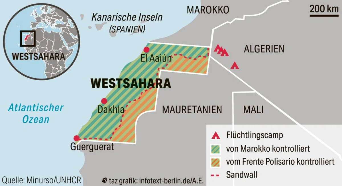 Über zwei Drittel des Gebiets in der Größe der alten Bundesrepublik sind von Marokko besetzt, der Rest ist in der Hand der Polisario und der Exilregierung der sogenannten Demokratischen Arabischen Republik Sahara (DARS), die in den sahrauischen Flüchtlingscamps im benachbarten Algerien sitzt.