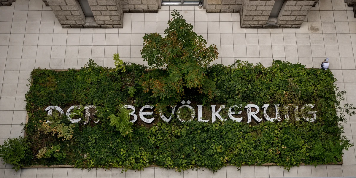 „Der Bevölkerung“ war meine Reaktion auf die Fremdenfeindlichkeit in der Bundesrepublik. 2003 war ich in Leipzig am Nikolaikirchhof eingeladen, mit einer permanenten Installation des Aufstands gegen die DDR-Regierung zu gedenken, die dort begann. Ich schlug vor, nachts auf die Nikolaikirche „Wir (alle) sind das Volk“ zu projizieren, die Parole des Aufstands „Wir sind das Volk“ mit der Anmerkung in Klammern, wer mit dem Volk gemeint ist. Der Wettbewerbsvorschlag eines anderen Künstlers wurde realisiert. Die Fremdenfeindlichkeit in Deutschland ist seither erschreckend gewachsen. 2017 bei der Documenta in Kassel habe ich „Wir (alle) sind das Volk“ in zwölf Sprachen auf großen Bannern am Friedrichsplatz aufhängen lassen.