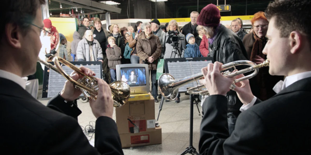 "Ist das hier eine Fahrkartenkontrolle?" Ihr Blick fällt auf die beiden blau gekleideten Sicherheitsmänner, die am Geländer der Treppe hinunter zur Linie 2 der U-Bahn-Station Schlump lehnen und sich unterhalten. Nein, das ist keine Fahrkartenkontrolle, das ist hier ein kleiner Teil des größten Konzerts der Welt, möchte man ihr antworten, aber da ist die junge Frau schon in Richtung Ausgang davongeeilt. Wäre sie geblieben, dann hätte sie den beiden Trompetern Matthias Müller und Mario Schlumperger zuhören können, wie sie im Bahnhof die Zweite Sinfonie von Brahms spielen.
