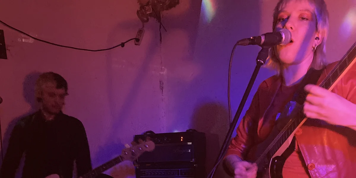 Ich verpasse den Anfang von Splizz, die ich auch kaum sehen kann, weil ich nur noch in der hintersten Ecke des Konzertraums Platz finde, der wie ein besonders kurioses, fensterloses Berliner Zimmer geschnitten ist und in dem es recht heiß ist, obwohl an der Wand eine Klimaanlage hängt, die, wie ich später sehe, auf 17 Grad hinarbeiten soll. Mir scheint, dass die Gitarristin und der Gitarrist abwechselnd und gemeinsam singen und in der Mitte eine Bassistin auf der Bühne steht, als eine Frau aus dem Publikum ruft: „Was habt ihr denn für eine geile Bassistin?“