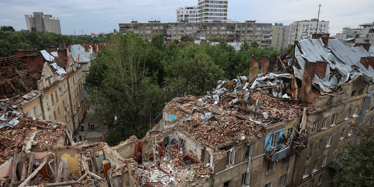 Die Stryiska-Straße in der westukrainischen Stadt Lwiw: Bauarbeiter sind immer noch damit beschäftigt, Trümmer und Bauschutt wegzuschaffen. Anfang Juli waren hier zwei russische Raketen vom Typ „Kalibr“ eingeschlagen. Zehn Leichen waren aus den Überresten der Häuser in der dicht bebauten Straße geborgen worden, Dutzende Menschen erlitten Verletzungen.