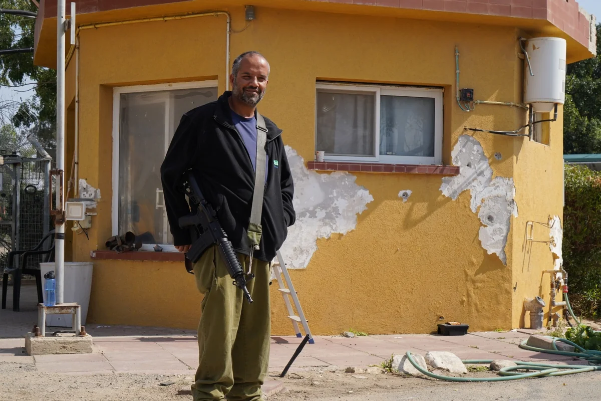 Acht Kilometer vom Grenzübergang Kerem Schalom entfernt bewacht Doron Stamker das Tor zur Kibbuzsiedlung Nir Jitzchak. „Bisher sind nur einige Arbeiter zurückgekommen, um sich um die 600 Kühe und die Hühner zu kümmern“, sagt der 50-Jährige. Um seine Schultern hängt ein Sturmgewehr, in der Wand des Wachhauses sind Einschusslöcher zu sehen. Im Fenster liegen die Reste einer Rakete aus Gaza, verformt wie Teile einer abstrakten Metallskulptur. „Wenn dort die Bomben einschlagen, dann wackeln hier die Häuser. Wir sollten nicht zurückkommen, solange drüben gekämpft wird“, sagt das Mitglied des Kibbuz-Sicherheitsteams.