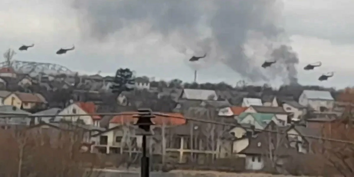 Den Vorstoß auf Kiew unternahmen russische Truppen aus Belarus unter anderem in der Sperrzone um das havarierte Atomkraftwerk Tschernobyl, das sie nach ukrainischen Angaben unter Kontrolle zu bringen versuchen, mit unabsehbaren Konsequenzen. Ihr Ziel war zunächst der wichtige Luftwaffenstützpunkt Hostomel 30 Kilometer westlich von Kiew. Seine Kontrolle würde Russland Luftlandungen für einen direkten Angriff auf Kiew ermöglichen. Im Verlauf der Kämpfe wurden mehrere russische Hubschrauber abgeschossen; die Aufnahmen wurden breit auf sozialen Medien geteilt. Am Abend landeten Berichten zufolge erste russische Fallschirmjäger auf Hostomel; die ukrainische Armee begann prompt eine Offensive, um sie einzukesseln.