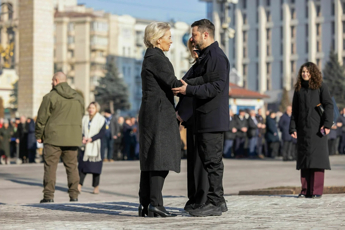 Man sei in Kyjiw, weil die Ukraine Europa sei. In diesem Kampf ums Überleben stehe nicht nur das Überleben der Ukraine, sondern auch Europas auf dem Spiel, schrieb von der Leyen auf X. Sie kündigte an, dass bereits im März eine Hilfszahlung von 3,5 Milliarden Euro an die Ukraine überwiesen werde. Auch andere Staaten, wie beispielsweise die nordischen Länder sowie Großbritannien, sagten Finanzhilfen teilweise in Milliardenhöhe zu. So will London die Ukraine mit 5,6 Milliarden unterstützen, Norwegen ist mit 3,5 Milliarden dabei.