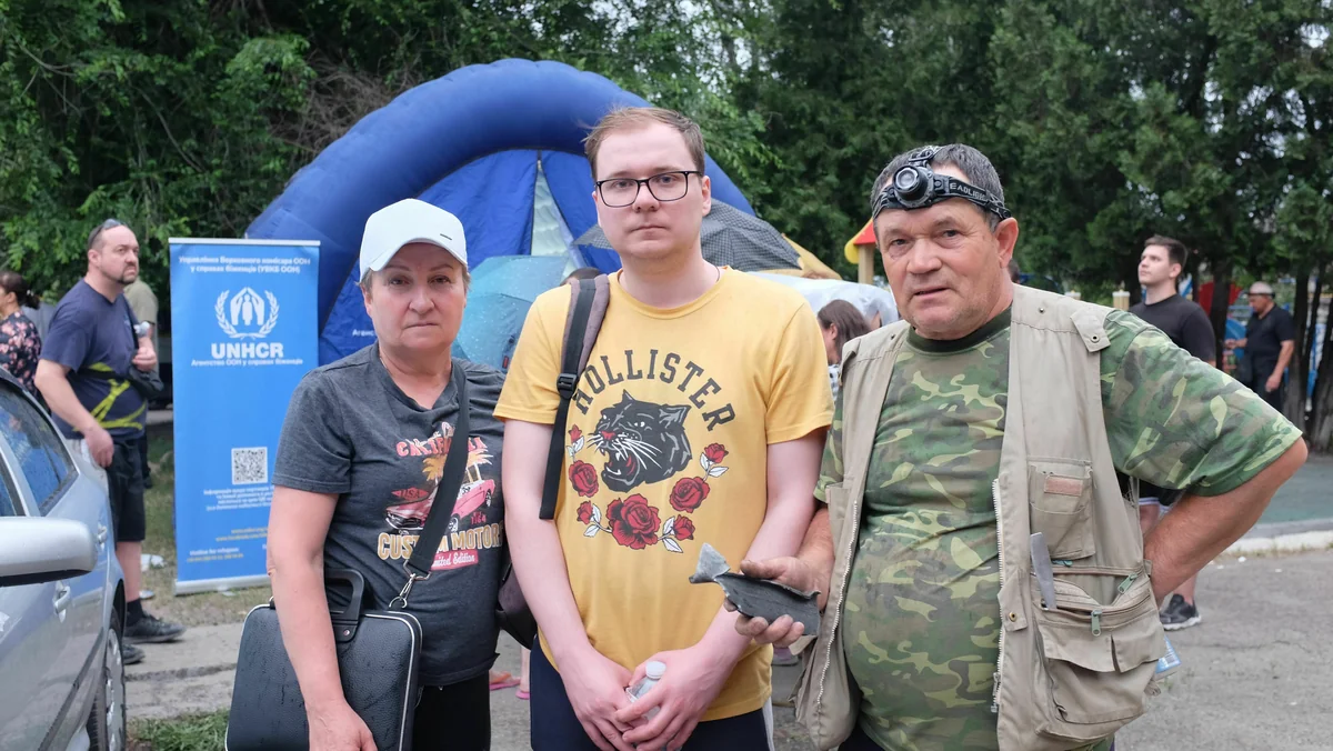 Anatolij Ilienko, seine Frau Svitlana und ihr Sohn Wladislaw warten zusammen mit dutzenden anderen aus der Nachbarschaft in der Schlange vor einem blauen UNHCR-Zelt. Überall wuseln Ehrenamtliche und Polizist:innen herum und wollen etwas tun.