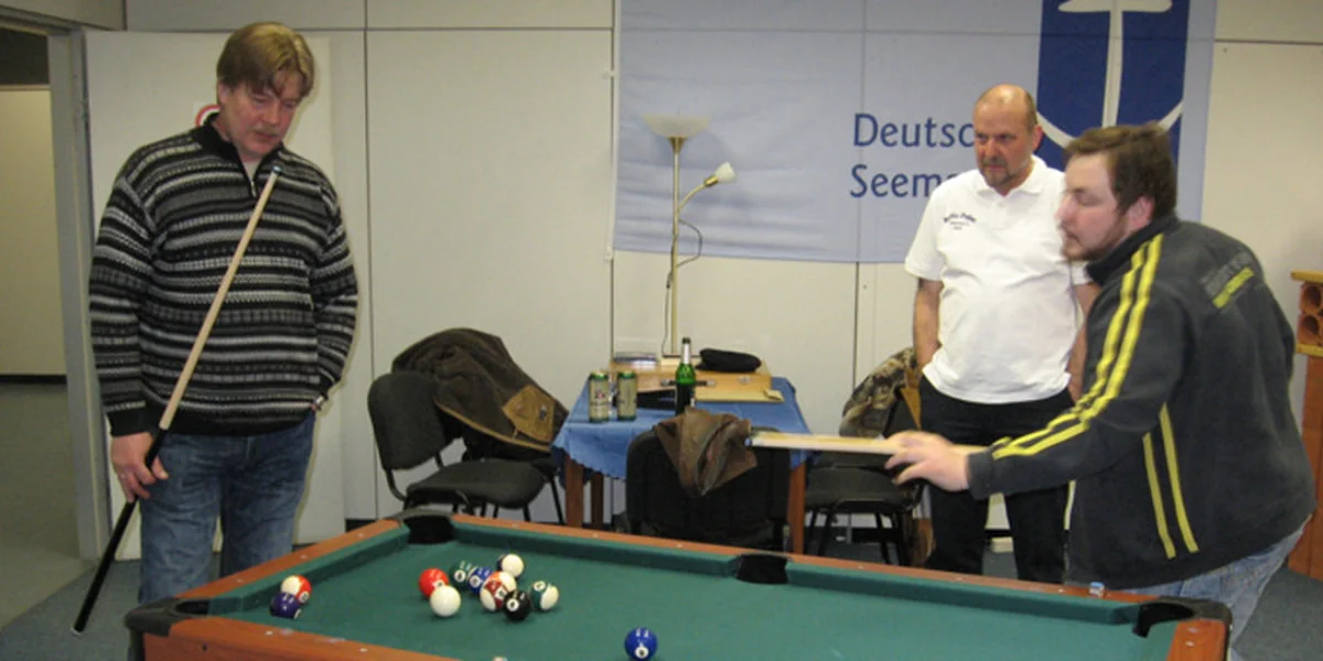 Zwei Männer vertreiben sich die Zeit, bis die Rechner frei werden, am Billardtisch. "Weil es an Bord meist schwankt, sind Tischspiele mit bewegten Bällen an Land besonders beliebt", sagt der Diakon und Seemannsbetreuer Rudi Saß. Am Spielniveau der Seeleute kann er erkennen, wie lange sie schon an Land sind.
