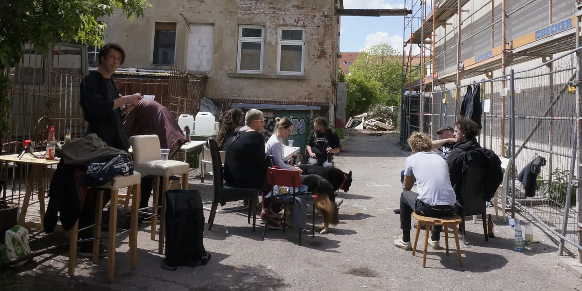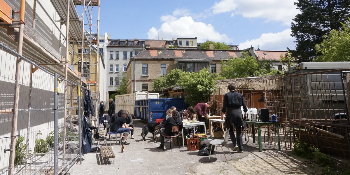 Ein dunkler Fleck auf dem Boden erinnert an die Stelle, wo vorgestern noch ein Schuppen stand. Auf dem Gelände der Kochstraße 124 im Leipziger Stadtteil Connewitz sitzen Donnerstagmorgen seit fünf Uhr einige Dutzend Leute beim Frühstück. Sie wurden in der Nacht spontan zusammengetrommelt, um im Zweifel die Toreinfahrt zu blockieren. Denn die Angst vor Entmietung ist akut: Anfang der Woche haben Bauarbeiter auf dem Gelände einen Schuppen und eine Garage abgerissen, eine Veranda abgeräumt, ein Fenster der Fabrik eingedrückt, Garagen mit Containern blockiert.