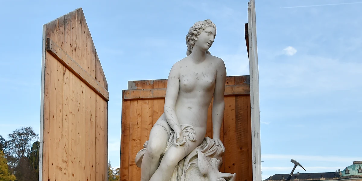 Wie es ihnen jetzt wohl geht, den Skulpturen, versteckt unter ihren Hüllen? Vielleicht sind sie ja auch von etwas befreit. Es gibt noch nicht einmal ein Namensschild mehr, das auf ihre Existenz verweist. Wer sie vorher nicht kannte, weiß nicht, wer hier Großes liegt. Sie müssen nun nichts darstellen, sich nicht mehr betrachten lassen. Sie haben die Erlaubnis, still zu sein, und läuten damit auch für uns einen Winter ein. Es ist schön im Park im Winter, in der kargen Stille, in der sich die Reize verschließen. Die kalte, klare Luft ist hier nun das eindrücklichste Element von allen.
