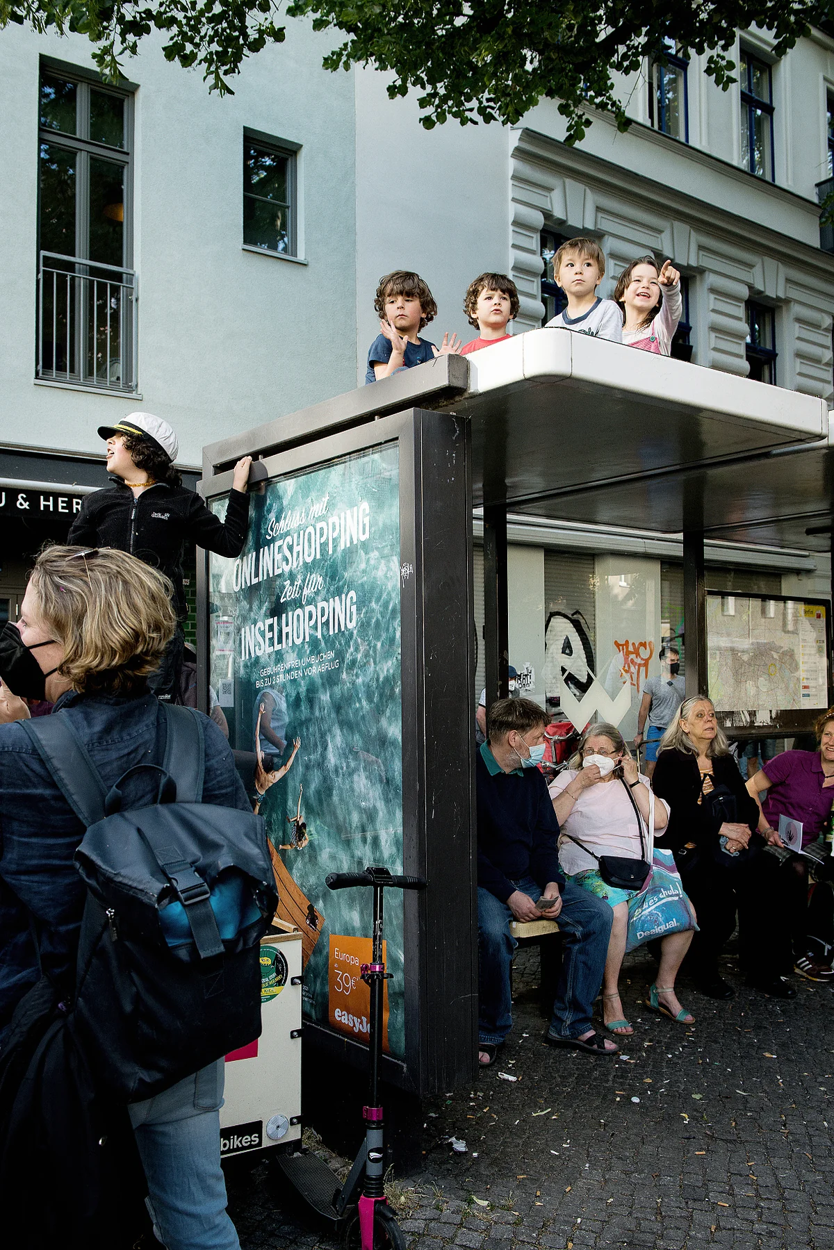 Tatsächlich sind am Ende fast vier Stunden vergangen. Die Sonne hat sich längst verzogen, Abendbrotzeit ist schon vorbei. Geradezu stürmisch ist es geworden, und die Menschen sind vom nunmehr kühlen Straßenpflaster aufgestanden, um ihre Jacken enger um sich zu wickeln. Vereinzelt müssen frierende Kleinkinder nach Hause gebracht werden. „Ich will das aber unbedingt zu Ende gucken!“, sagt der Kleinkindvater hinter mir energisch zu seiner Frau. Frau und Kind verpassen danach das Finale, das nur furios genannt werden kann. Denn zum Abschluss singen alle DarstellerInnen ein Widerstandslied in mehreren Sprachen, das geradezu körperlich zum Mitmarschieren aufruft. Danach will der Schlussapplaus kein Ende nehmen.