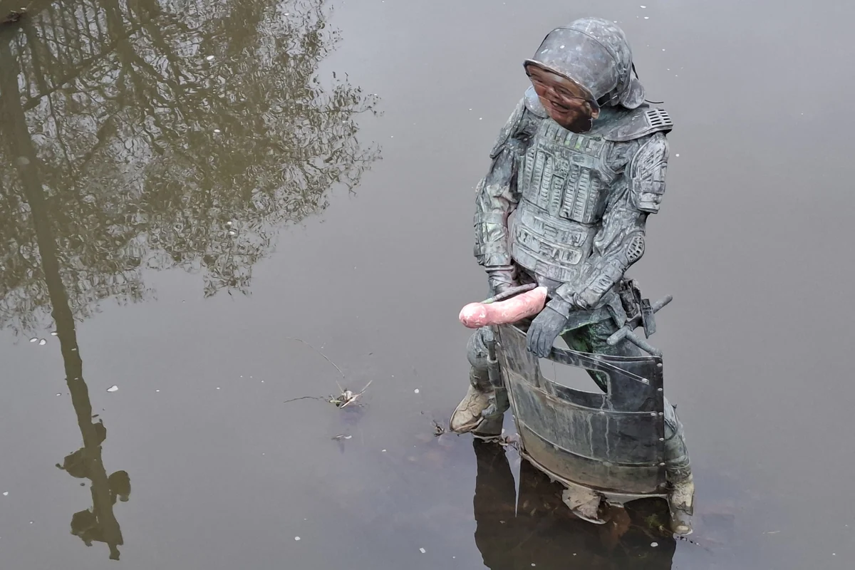 Die Osnabrücker Antimilitarismus-Initiative Rausmetall hat Biss. Vergangenen Freitag hat sie in einer Guerilla-Intervention Fernando Sánchez Castillos Bronze-Skulptur Fountain of Wishes umgestaltet, einen lebensgroßen Polizisten, der seit rund 15 Jahren im Stadtfluss Hase steht, mit Körperpanzer, Schlagstock, Schild und Pumpgun.