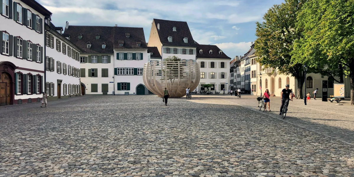 Es muss Kunst sein, was da seit Neuestem auf dem Münsterplatz in Basel steht, denn es kann demnächst schon wieder weg. Nein, es geht ganz klar um Kunst im öffentlichen Raum, sind doch die Gegebenheiten sehr auffällig. Denn es steht dort, wo das Naturhistorische Museum den Platz begrenzt, ein hübscher kleiner Baum auf einem Podest, eingefasst von einer umlaufenden Holzlamellenkonstruktion, die ausschaut wie ein luftiger Korb.
