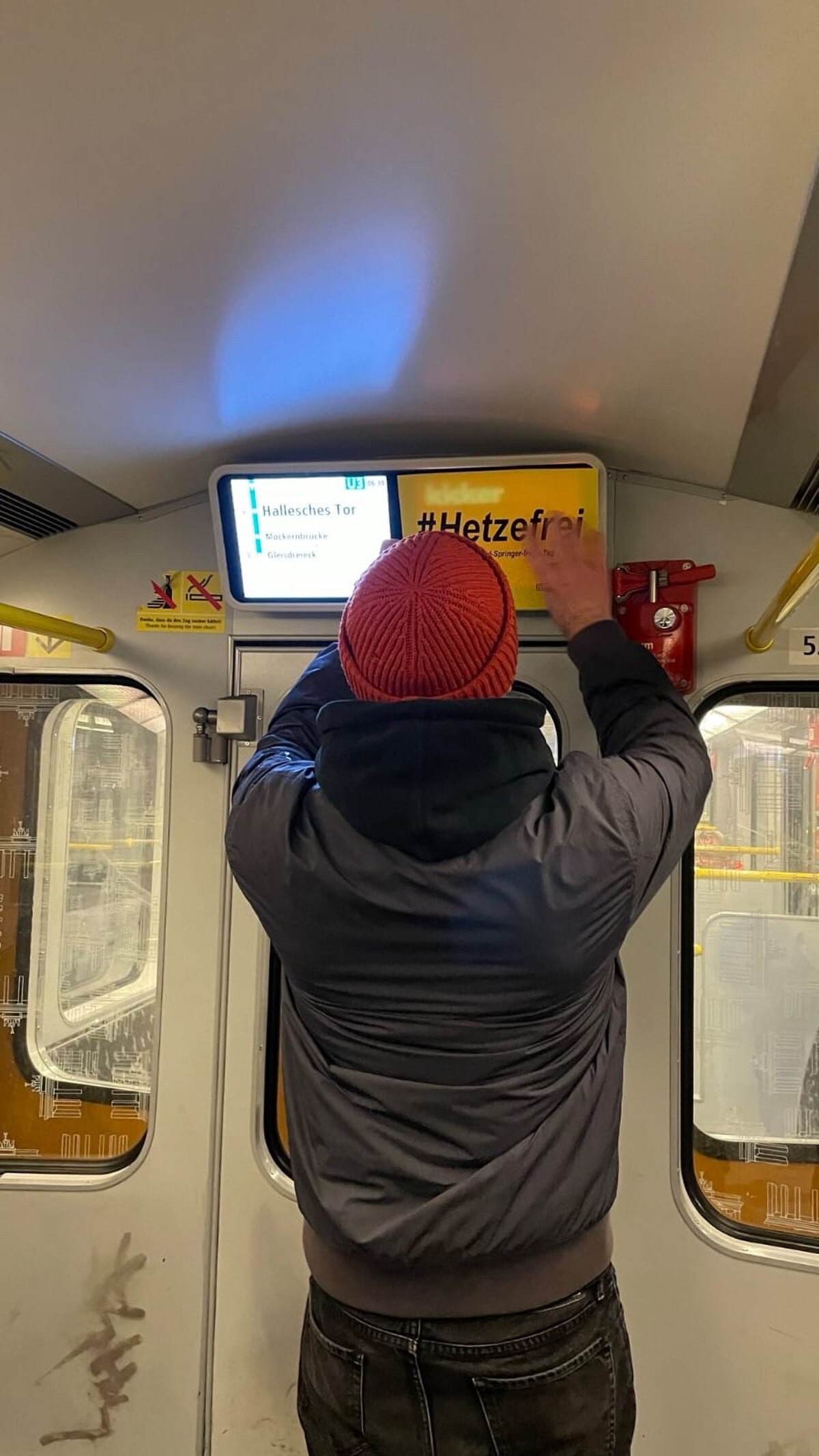 Sobald die Türen geschlossen sind, schwärmen die drei durch den Wagen und überkleben die Bildschirme. „Immer die rechten“, dort, wo die Mc R&D GmbH das Berliner Fenster unter anderem mit Nachrichten von Springer betreibt. Laut Recherchen von „Springer raus“ ist der Deal für die BVG ein Minusgeschäft, in dem öffentliche Gelder verschwinden. „Werft Springer aus dem Fenster“, fordert die Gruppe auf Instagram.