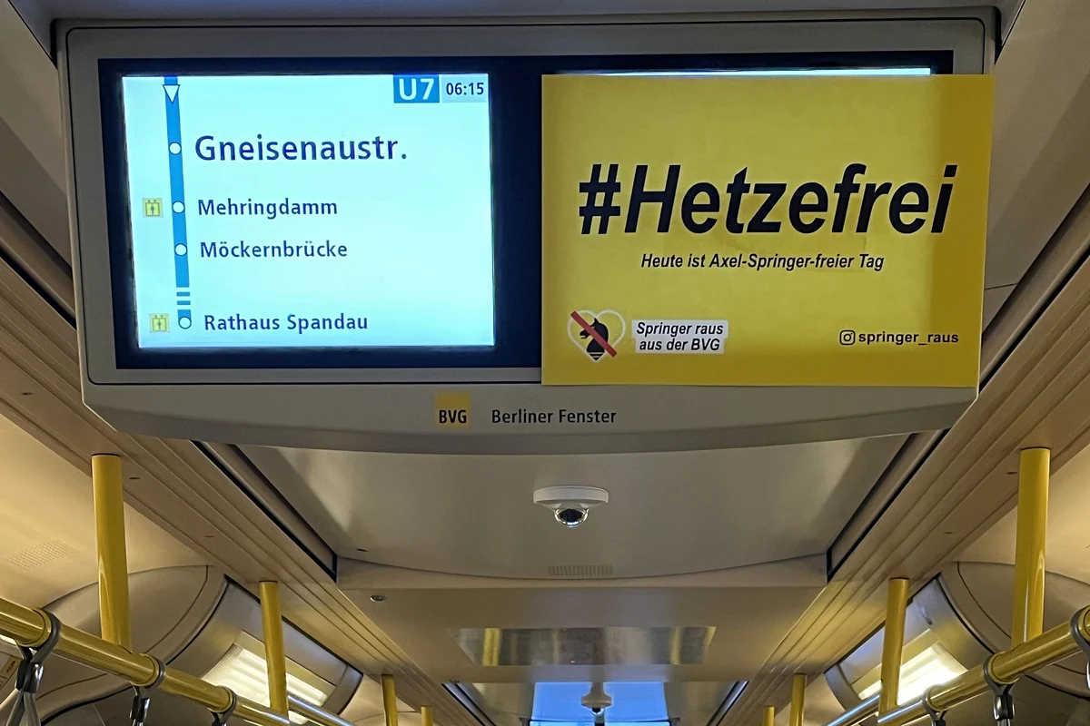 Dieses tritt mit der Kampagne „Springer raus aus der BVG“ seit Monaten „im öffentlichen und digitalen Raum für eine U-Bahn ohne rechte Hetze“ ein. Denn im „Berliner Fenster“ in den Wagen der BVG laufen Schlagzeilen der „kleinen Bild-Schwester“ B. Z. Die BVG solle aufhören, sich hinter „undurchsichtigen Verträgen“ zu verstecken, „endlich Haltung zeigen“ und das Senden von Inhalten der B. Z. stoppen. Eine entsprechende Petition haben bereits mehr als 25.000 Berliner*innen unterschrieben.