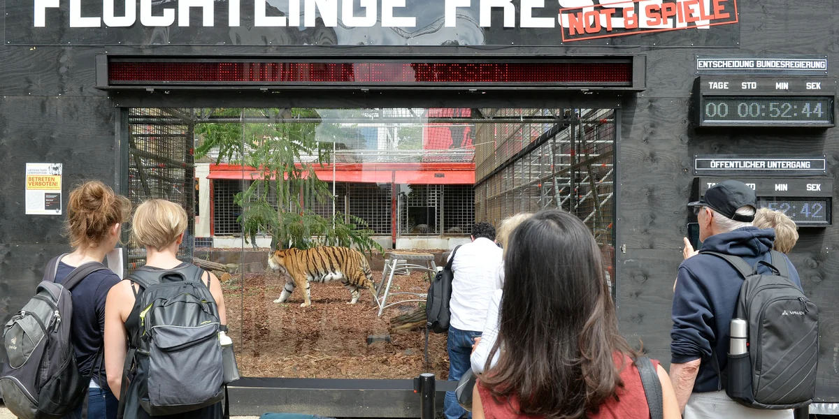 Mit viel Tamtam hatte das Zentrum, das sich einem „radikalen Humanismus“ verschrieben hat und in der Vergangenheit immer wieder Aufsehen erregt hat, in der letzten Woche seine neueste Kunstaktion in Berlin eingeleitet: In einem Käfig vor dem Maxim-Gorki-Theater nahe des Berliner Regierungsviertels hat die Gruppe Schauspieler in römischen Kostümen platziert und darüber hinaus vier Tiger, denen sich laut Ankündigungen der Künstler an diesem Dienstagabend Flüchtlinge freiwillig zum Fraß vorwerfen lassen wollen. Eine Kunstaktion, die, wie immer, polarisiert. Ihr Titel: „Not und Spiele: Flüchtlinge fressen“.