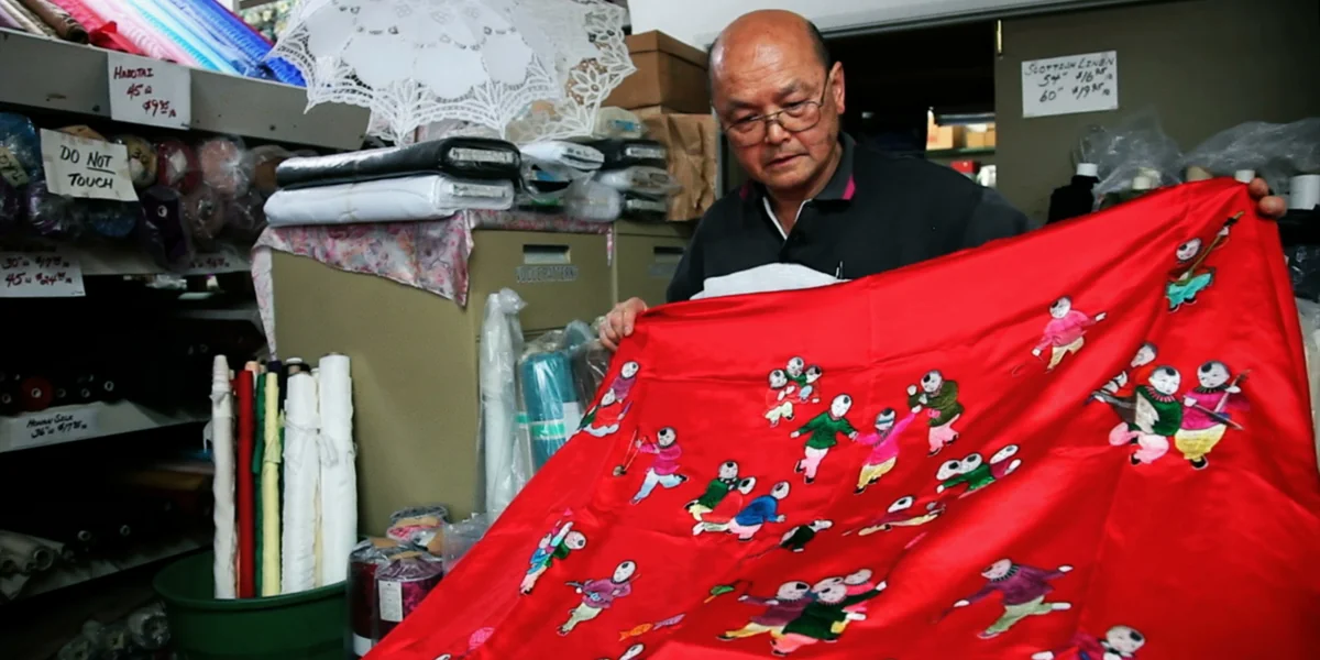 In „Oriental Silk“ von Xiaowen Zhu erzählt Kenneth Wong ihr die Geschichte seines Ladens für Seidenstoffe. Die Künstlerin und Autorin entdeckte ihn in einer der teuersten Einkaufsmeilen der Welt, im Gebiet des Rodeo Drive in Beverly Hills, Los Angeles.