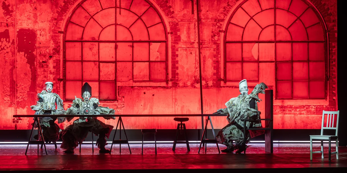 Und dann gibt es da auch noch das groteske Antikriegsstück „König Ubu“ von Alfred Jarry von 1896. Eine Persiflage auf Macbeth, Richard III. und alle totalitären Herrscher – aufgeführt im Weimarer E-Werk, während viele Kilometer entfernt zeitgleich der Tyrann Prigoschin vom Himmel fällt. Der legendäre Regisseur Robert Wilson hat das Stück nur „Ubu“ genannt, benutzt wenige Text-Fragmente. Wie Puppen sitzen die prächtig mit Zeitungsfetzen ausstaffierten Protagonisten auf der Bühne, Sounds und infantiler Text kommen aus dem Off – gesprochen etwa von der Schauspielerin Angela Winkler.