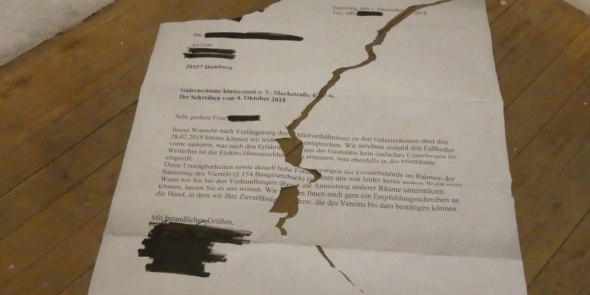 Die Kündigung zeige, dass nicht-kommerzielle Kunstorte in zentraler Lage verdrängt werden, sagt Angelovska. Die Künstler*innen hätten nach einer Form gesucht, adäquat auf die Situation zu reagieren und sich entschieden, das Kündigungsschreiben als Dokument auszustellen, das exemplarisch für Verdrängungsmechanismen stehe. Seit vergangenem Samstag hing es in vergrößerter Form im Schaufenster des Hinterconti. Darüber hinaus installierten die Künstler*innen in den Räumen eine Wandzeitung mit dem Schriftverkehr der letzten Monate mit dem Vermieter. In allen Dokumenten wurden laut Angelovska Namen, Adressen und Telefonnummern geschwärzt.