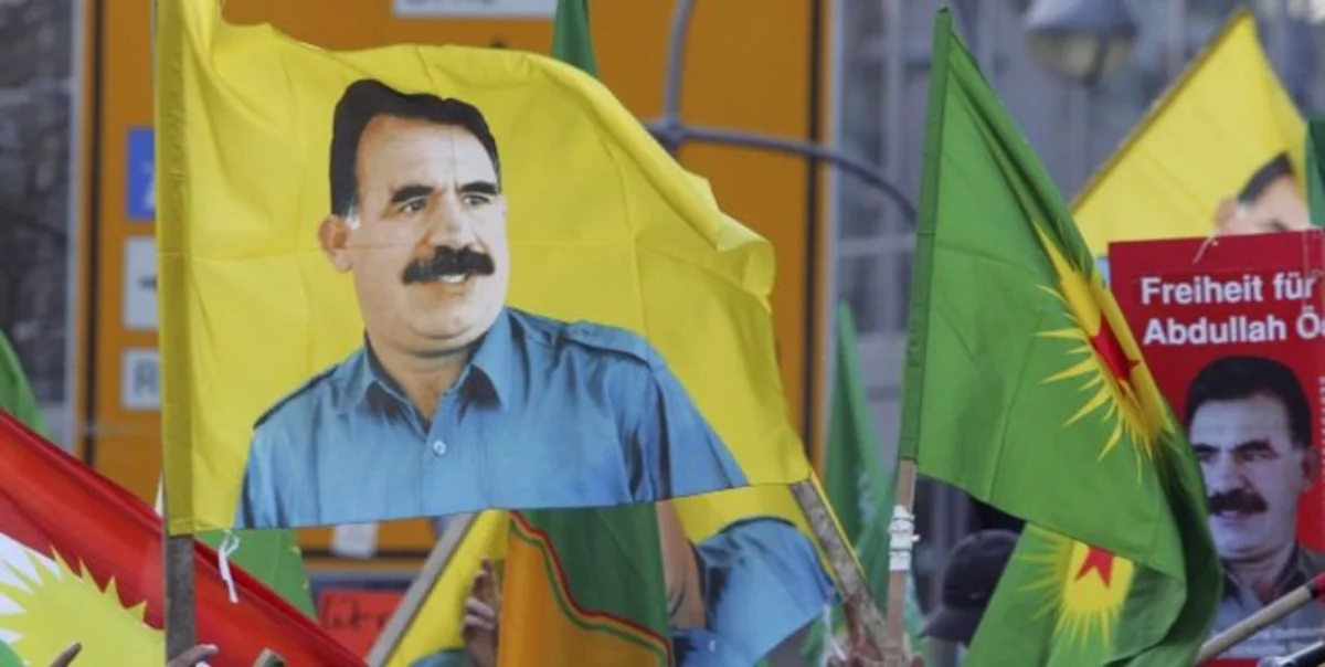 Ohne Gewalt, aber mit PKK-Chef Öcalan: Fahnen bei der Kurdendemo am Sonntag in Berlin Bild: AP