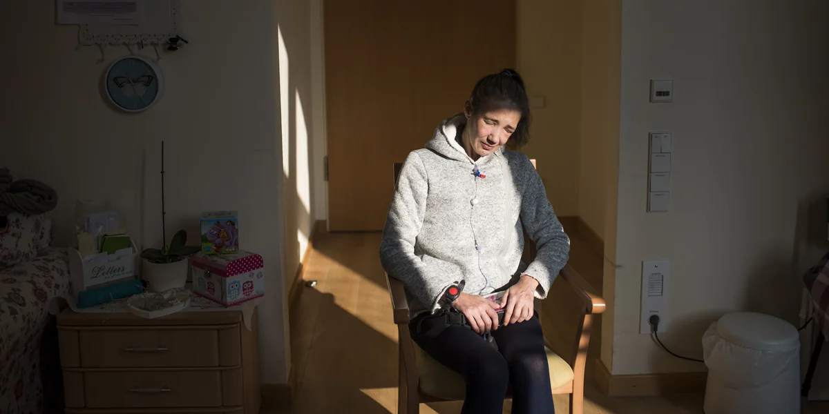 Manuela Fahl, 47, leidet an Angina abdominalis. Ihre Adern verschließen sich, und ihr Darm stirbt ab. Eine Pumpe führt ihr ständig Schmerzmittel zu. Beim ersten Gespräch redet sie leise und stockend, so sei das in ihren Tiefphasen, sagt sie. Beim zweiten Treffen ist sie lebhafter.