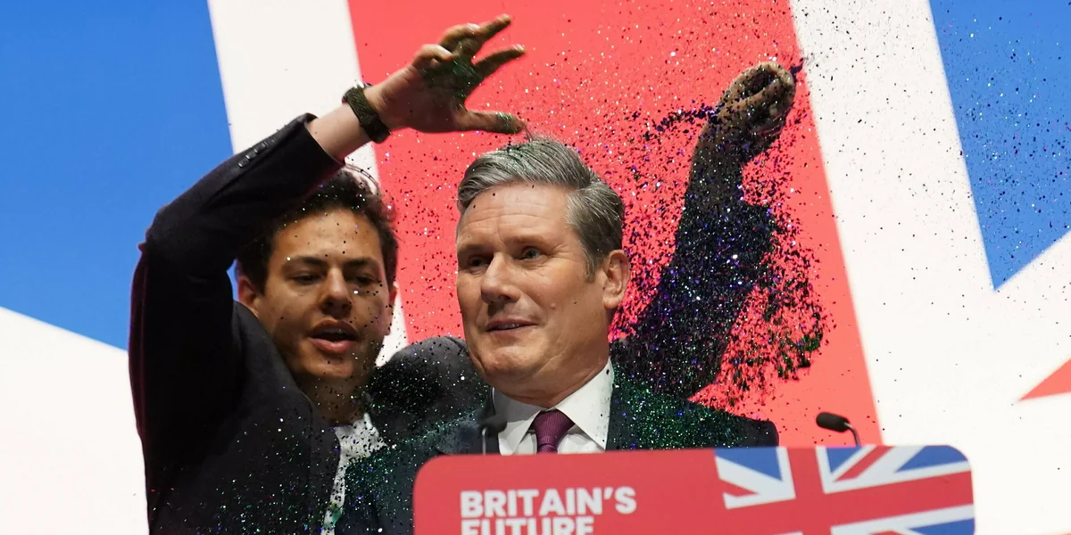 Verschwörungstheorien hätten nun ihr Zuhause bei den Tories, während Labour seine Hausaufgaben gemacht habe. Diesen Punkt unterstrich Starmer bereits am Anfang seiner Rede, als ein Aktivist für Bürger:innenparlemente auf ihn zustürmte und unerwartet Glitzerkleber über ihn schüttete.