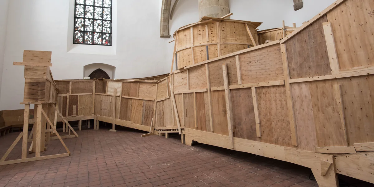 Gebaut ist „Forma Forma“ aus Recyclingmaterialien, aus Tischlerplatten vor allem. Das bildet einen schönen Kontrast zum Kirchenschiff der Kunsthalle, die in einem ehemaligen Dominikanerkloster aus dem 13. Jahrhundert untergebracht ist. Hier die alten, für die Ewigkeit gedachten Steine mit den bunten Glasfenstern, dort das scheinbar als Provisorium zusammengezimmerte Holzgebilde, das irgendwann der nächsten Ausstellung weichen wird.