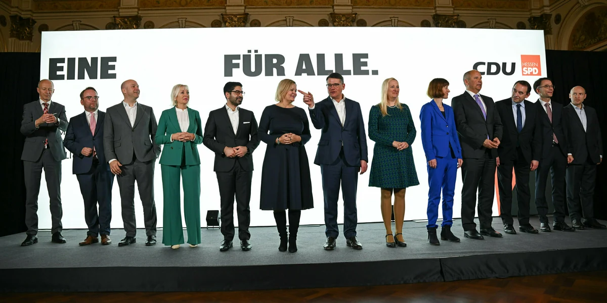 taz „Eine für alle“ steht auf dem Banner der selbsternannten ersten „demokratisch-christlich-sozialen Koalition“, die nach der konstituierenden Sitzung des Hessischen Landtags am kommenden Donnerstag das Bundesland Hessen regieren soll. Punkt zwölf Uhr stellte sich dafür am Montag die designierte hessische Landesregierung im Prunksaal der Wiesbadener Casinogesellschaft zum Gruppenfoto auf. In ihrer Mitte die Landesvorsitzenden der künftigen Koalitionspartner CDU und SPD, die beide in ihren Ämtern verbleiben: Boris Rhein als wiedergewählter hessischer Ministerpräsident und Nancy Faeser als Bundesinnenministerin.