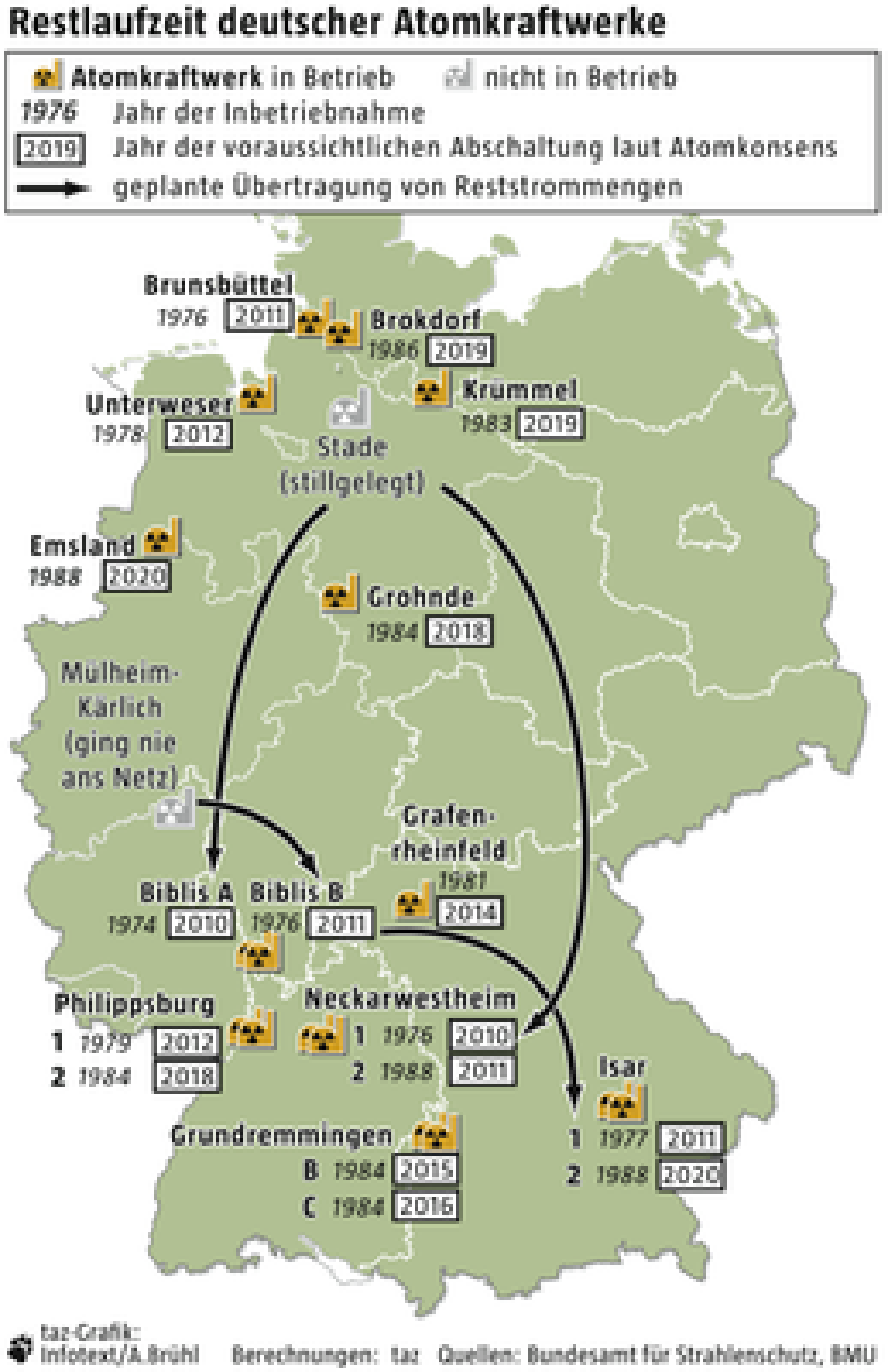 Um zu verhindern, dass ihre ältesten Kraftwerke vorher stillgelegt werden, bleibt den Betreibern - neben Tricks wie gedrosselter Leistung und verlängerter Wartung - nur eine Möglichkeit: Sie müssen Strommengen von einem AKW zum anderen übertragen. Diese Möglichkeit hatte Rot-Grün eigentlich vorgesehen, damiti ältere Reaktoren früher und neuere im Gegenzug später vom Netz gehen können. Dcoh unter bestimmten Bedingungen können auch Alt-Reaktoren davon profitieren.